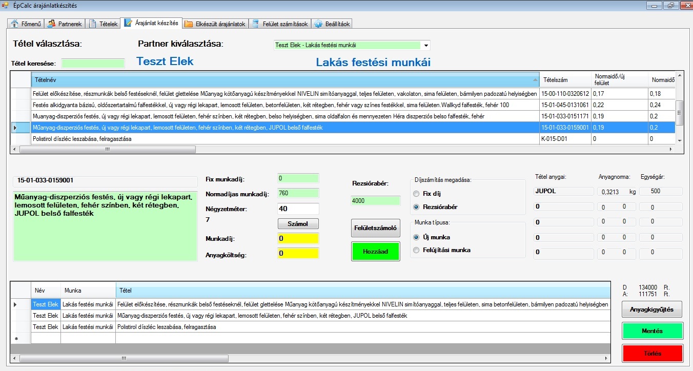 Ezen az oldalon készítjük el az árajánlatot. Első lépésben kiválasztjuk a partnert a legördülő listából. A felső táblázatban találjuk a tételeinket amit a 'Tételek' oldalon létrehoztunk. Kiválasztunk egy tételt a táblázatból, ilyenkor az oldal középső részén megjelenik az összes fontos információ. Megadjuk a munka típusát és díjszámítás módját. Ezután csak a mennyiséget adjuk meg és a 'Hozzáad' gomb megnyomásával hozzá adtuk a tételt az árajánlatunkhoz. A mennyiség kiszámításához innen is átléphetünk a felületszámoló modulba és az ott kapott eredményeket egyszerűen beilleszthetjük a négyzetméter rubrikába. Amikor végeztünk az összes tétel hozzáadásával, akkor mentsük el az árajánlatot a 'Mentés' gomb megnyomásával. Az ajánlat összeállítása közben információt kapunk a jelenlegi anyagköltségről és munkadíjról az oldal jobb oldalán. Az 'Anyagkigyűjtés' gomb megnyomásával megkapjuk a tétélhez felhasznált anyagok listáját és a munkához szükséges anyagmennyiségét.