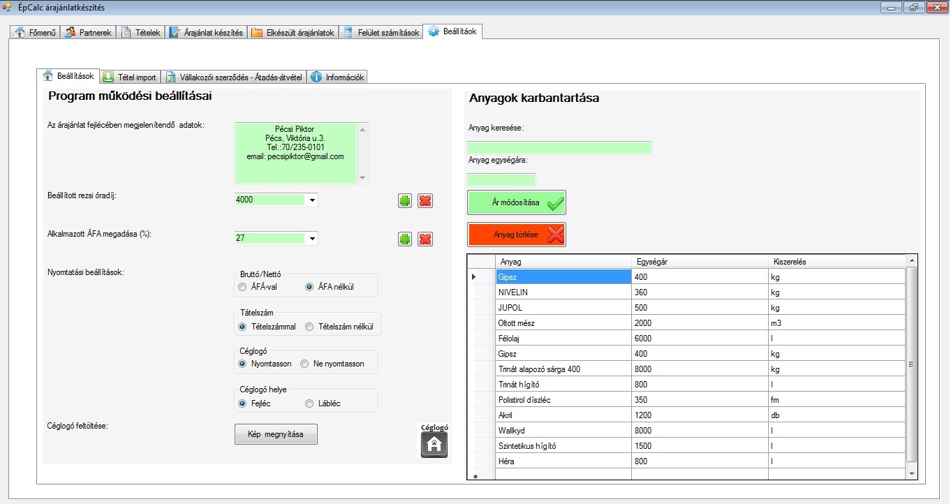 A program alapbeállításait ezen az oldalon lehet elvégezni. Megadhatjuk azokat az adatainkat amit az elkészült árajánlat fejlécében szeretnénk látni. Itt kell megadni a programban használni kívánt rezsiórabért és a használt ÁFA kulcsot. Beállíthatjuk, hogy az árajánlat nyomtatásánál milyen adatok jelenjenek meg a dokumentumban. Feltölthetünk egyedi céglogót, ami a létrehozott PDF dokumentumban megjelenik. Kiválaszthatjuk azt is hogy a céglogót a fejlécben vagy a láblécben szeretnénk-e látni. Itt tudjuk elvégezni a tételekhez használt anyagok átárazását is.