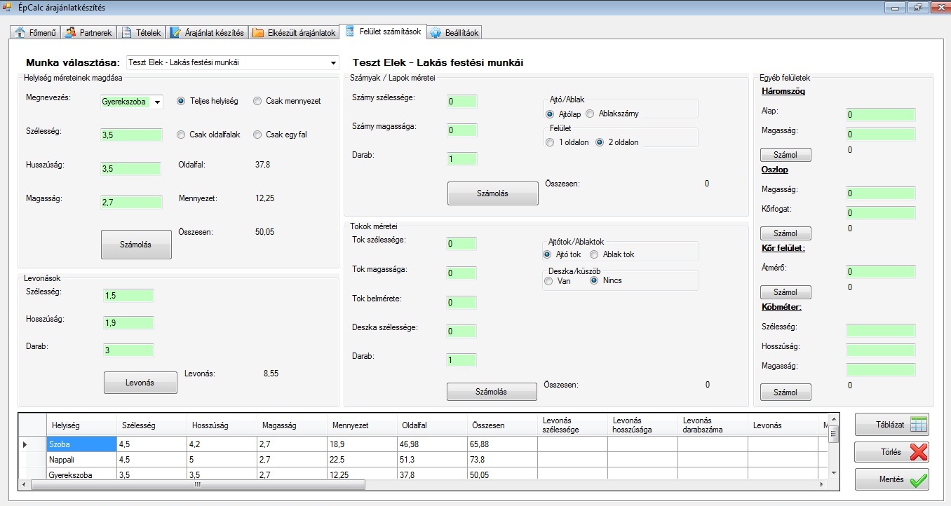 Egyszerűen és gyorsan összeállíthatunk egy felmérési naplót. A kapott eredményt táblázatban is megjeleníthetjük. Egy gombnyomásra beilleszthetjük a kapott eredményt az árajánlat összeállításához, a 'Árajánlat készítés' oldal megfelelő helyére.