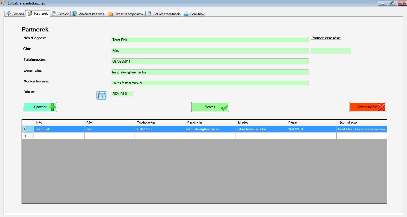 Partnerek felvétele az adatbázisba. A program a partner nevével egy külön mappát hoz létre, amiben az elkészült árajánlatok mentésre kerülnek. Egy név alatt több árajánlat is menthető. A megadott e-mail mezőben található címre küldi el a program az elkészült árajánlatot.