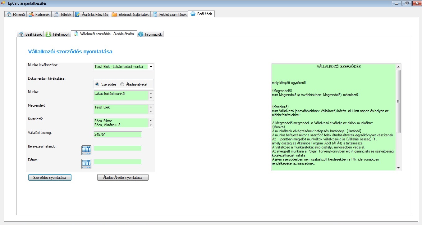 A programban lehetőség van Vállalkozási szerződés és Átadás - átvételi jegyzőkönyv nyomtatására. Ehhez csak egyszerűen ki kell választani egy elkészített árajánlatot és a szoftver automatikusan beilleszti a nyomtatandó dokumentumba az árajánlatban szereplő adatokat. A keltezés dátumát és a befejezési határidőt külön kell megadni. A program tartalmaz előre megírt dokumentum sablonokat. Ezek a sablonok tetszés szerint módosíthatóak.