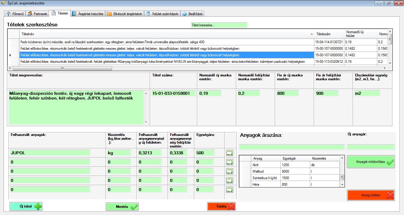 Ezen az oldalon tudunk tételeket létrehozni, módosítani. Új tétel létrehozásánál meg kell adni a tétel nevét, tételszámot, új és felújítási normaidőt, új és felújítási munka fix árát. Az árajánlat készítés közben a munkadíj árképzés kétféle képen történhet: 1. a megadott normadíj és rezsiórabér szorzata. 2. a megadott fix ár alapján. Tételenként öt anyagot tudunk elmenteni. Az anyag neve után meg kell adni a kiszerelés mértékegységét, az új és a felújításhoz használandó anyagmennyiséget egységekre lebontva, valamint az anyag nettó egységárát. Az anyagok sor végénél található nyíl megnyomásával elmentjük az anyagot egy táblázatban, amit utána könnyen módosíthatunk árváltozás esetén. Az anyagárat az árajánlatban az anyagnorma * egységár és a megadott négyzetméter(db; fm; m3; stb. a tétel fajtájától függően) szorzataként kapjuk meg.